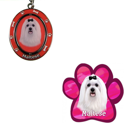This bundle includes One (1) E&S Pets Keychain #KC-24 and One (1) E&S Pets Magnet #13125-24 The magnet is UV Coated The Magnet is Great for car, truck, refrigerator, mailbox, locker, or any magnetic surface The Spinning keychain has a picture on each side. one of each: Maltese Spinning Keychain and Paw Magnet Free and fast shipping to all U.S. addresses